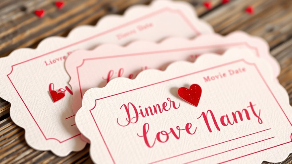 After you’ve finished designing and personalizing your love coupons, it’s time to assemble and finish them to create a polished, professional look. First, cut out each coupon neatly along the edges. Next, fold them evenly if you’re using folded cards or tabs. Then, add finishing touches like rounded corners with a corner punch or decorative edges with scissors. To guarantee durability, consider laminating the coupons or applying a clear sealant. Additionally, incorporating proper finishing techniques can help your love coupons withstand handling over time. You might also explore cost-effective production methods to make your project both beautiful and budget-friendly. For added customization, you can also incorporate personalized designs or embellishments to make each coupon unique. Finally, punch a small hole in each coupon’s corner and thread a ribbon or string through for easy presentation. Remember these tips: