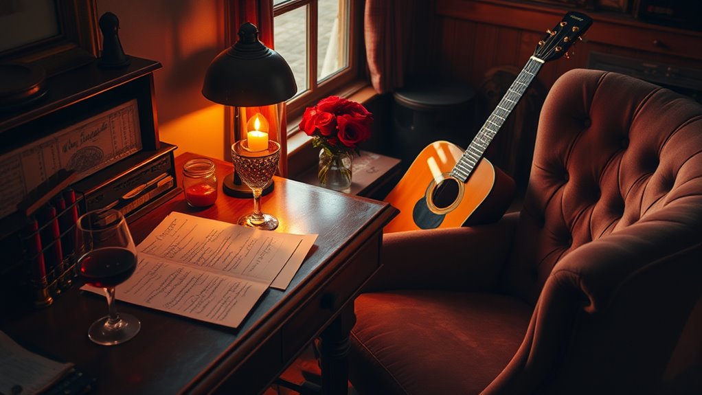 Have you ever noticed how your strongest feelings can spark the best ideas for a love song? When you’re overwhelmed by love, longing, or even heartbreak, let those emotions guide your songwriting. Pay attention to what makes your heart race or your mind spin—these are powerful sources of inspiration. Write down your feelings, whether they’re joyful or bittersweet, and use vivid imagery to capture those moments. Reflect on specific experiences or sensations that remind you of love’s intensity. Don’t hold back—embrace your honesty. Authentic emotions create genuine lyrics that resonate deeply. Exploring emotional triggers can help you connect more authentically with your audience. Recognizing the impact of personal growth through emotional expression can deepen the relatability of your song. Incorporating creative expression techniques can further enhance your songwriting process. Remember, the rawness of your feelings can turn into compelling melodies and lyrics that truly express your unique love story. Tapping into creative inspiration from your personal experiences can further enrich your songwriting process. Additionally, understanding how curiosity fuels your creative process can open new avenues for songwriting exploration.