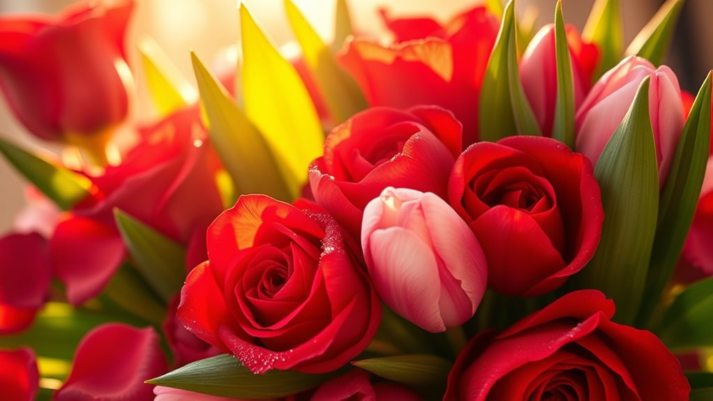Red roses have long been cherished as a powerful symbol of love and passion, making them a popular choice for romantic gestures on Valentine’s Day. When you give someone red roses, you’re expressing deep affection and desire without words. Their vibrant color symbolizes love, while their fragrance evokes intimacy. Red roses also convey respect and admiration, making them versatile for various romantic contexts. Choosing a bouquet of red roses shows thoughtfulness and sincerity, often sparking emotional connections.