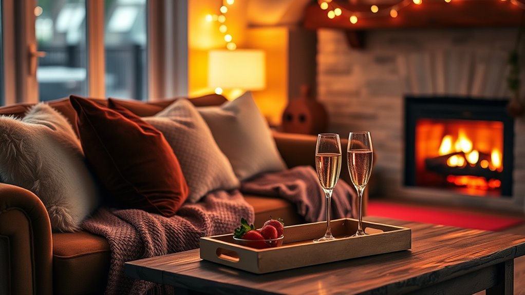 Creating a cozy and relaxing space for your Valentine’s Day staycation begins with thoughtful decor choices that promote comfort. Start by selecting soft, plush textiles like throw blankets and cushions to invite relaxation. Incorporate warm, inviting colors such as deep reds, soft pinks, or calming neutrals to set a soothing tone. Use cozy furniture arrangements that foster intimacy and easy conversation. Add personal touches like framed photos or sentimental keepsakes to make the space feel special. Keep clutter minimal to create a peaceful environment. Incorporate natural elements like potted plants or flowers to add freshness and vibrancy. By choosing decor that emphasizes softness and warmth, you’ll craft a welcoming retreat where you and your loved one can unwind and truly enjoy your time together.