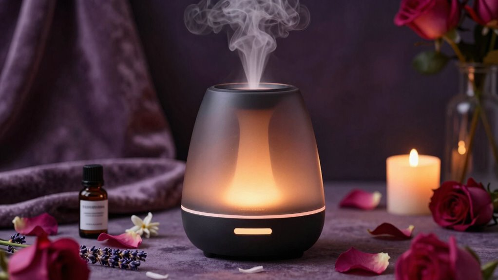 Different diffuser types create unique romantic ambiances. Ultrasonic diffusers produce a fine mist and gentle light, fostering intimacy and calm. Nebulizing diffusers release concentrated scents quickly, intensifying the mood. Evaporative diffusers offer a softer, subtle scent, perfect for a relaxed evening. I find that choosing the right diffuser depends on the atmosphere you want—whether it’s passionate, cozy, or tranquil—each adds its own special touch to your romantic setting.
