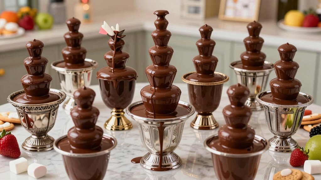 I’ve compiled a list of the 15 best chocolate fountain sets for 2026, focusing on capacity, design, and ease of use. From elegant 3- and 4-tier stainless steel models to compact mini fountains perfect for small gatherings, I’ve covered options suitable for any event. Whether you want a stylish centerpiece or a portable option, these sets offer durability and performance. Keep going to discover all the top picks and what makes them stand out.