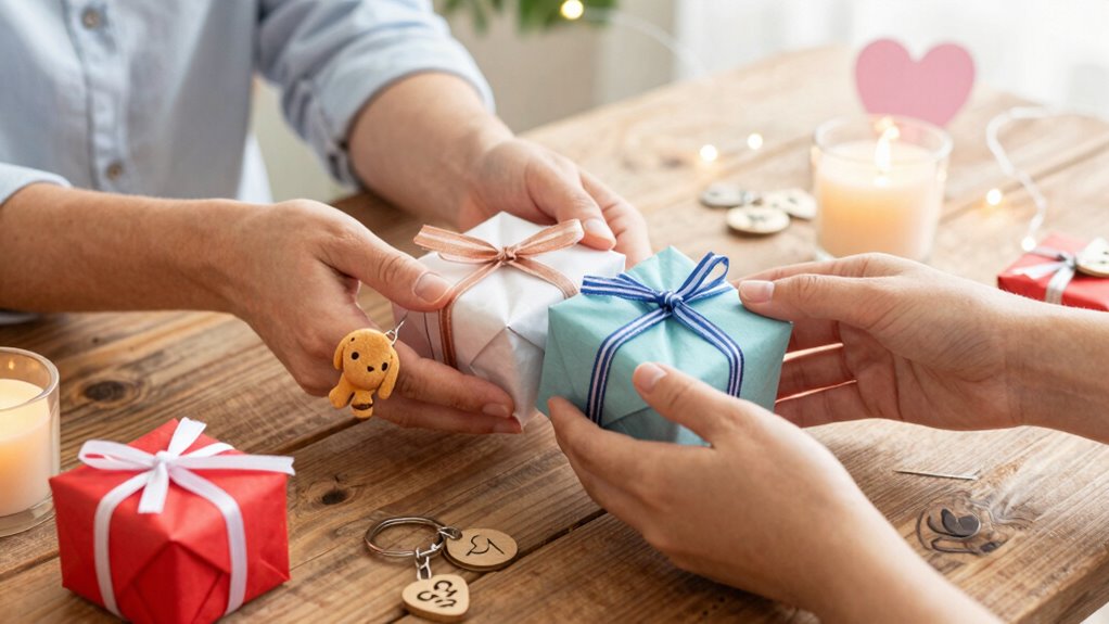 When selecting cute couple gifts under $15, paying attention to unique design elements can make all the difference in creating something memorable. I look for symbols like hearts, infinity signs, or matching motifs that highlight the connection and love between partners. Playful visuals, such as punny characters or quirky shapes, add a fun and distinctive touch that stands out. Customizable features, like engraved names or personalized messages, make the gift truly one-of-a-kind. Creative use of materials—think crochet, silicone, or stainless steel—enhances both the look and tactile feel. Thoughtful details, like dual pieces that form a complete picture when joined, reinforce the theme of unity. These design elements help craft a gift that feels personal, meaningful, and memorable without breaking the bank.