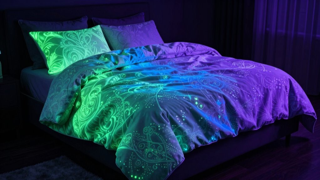 I find that glow-in-the-dark blankets made from high-quality polyester or nylon are the most durable for glowing properties. These materials act like a sturdy canvas, holding the glow pigments like stars in a night sky, ensuring lasting brightness. Their resilience withstands frequent washes and daily use, much like a steadfast lighthouse guiding you through darkness. Choosing these fabrics guarantees a blanket that shines bright and lasts longer, giving you comfort and magic night after night.