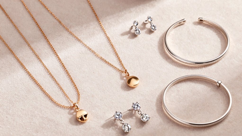 When shopping for jewelry under $100, it’s important to take into account her material preferences to make sure your gift aligns with her style and needs. Think about whether she prefers precious metals like gold, sterling silver, or platinum, or if she’s comfortable with plated or alloy options. Also, consider her skin sensitivities—choose hypoallergenic pieces such as nickel-free or titanium jewelry to prevent any allergic reactions. Durability matters too; select materials that can handle daily wear without tarnishing or damage. If she appreciates meaningful touches, look for jewelry featuring birthstones, charms, or motifs that hold personal significance. Balancing her preferences with quality ensures your gift will be both beautiful and suitable for her lifestyle.
