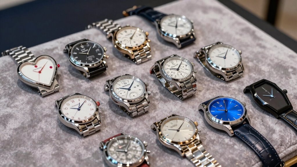 When choosing a distinctive watch for Valentine’s Day, I concentrate on key elements like customization choices and style harmony to make it memorable. I also evaluate the material quality and movement accuracy to guarantee longevity and precision. Finally, I focus on size and fit to ensure it feels comfortable and aligns with the wearer’s preferences.